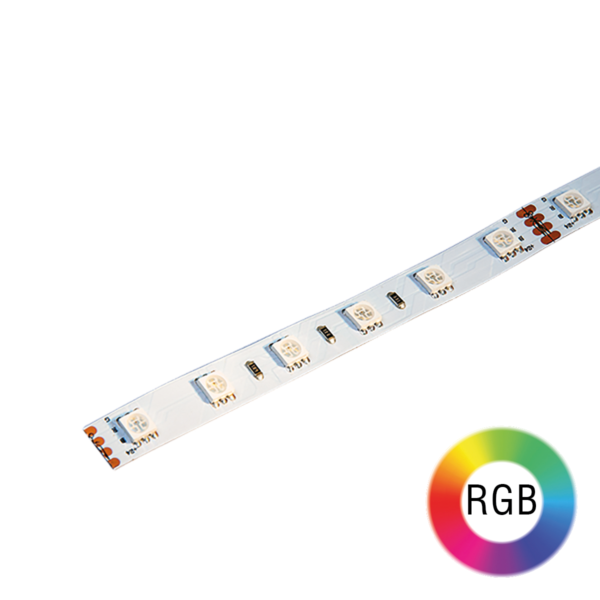 Flexible LED tape on roll with colour change, quick and easy installation due to the already applied double-sided 3M adhesive tape, supply cable easy to attach, the tape can be shortened every 100mm (marks between the LEDs). Afterwards the tape can be reconnected without soldering with the connecting clip or the cables.