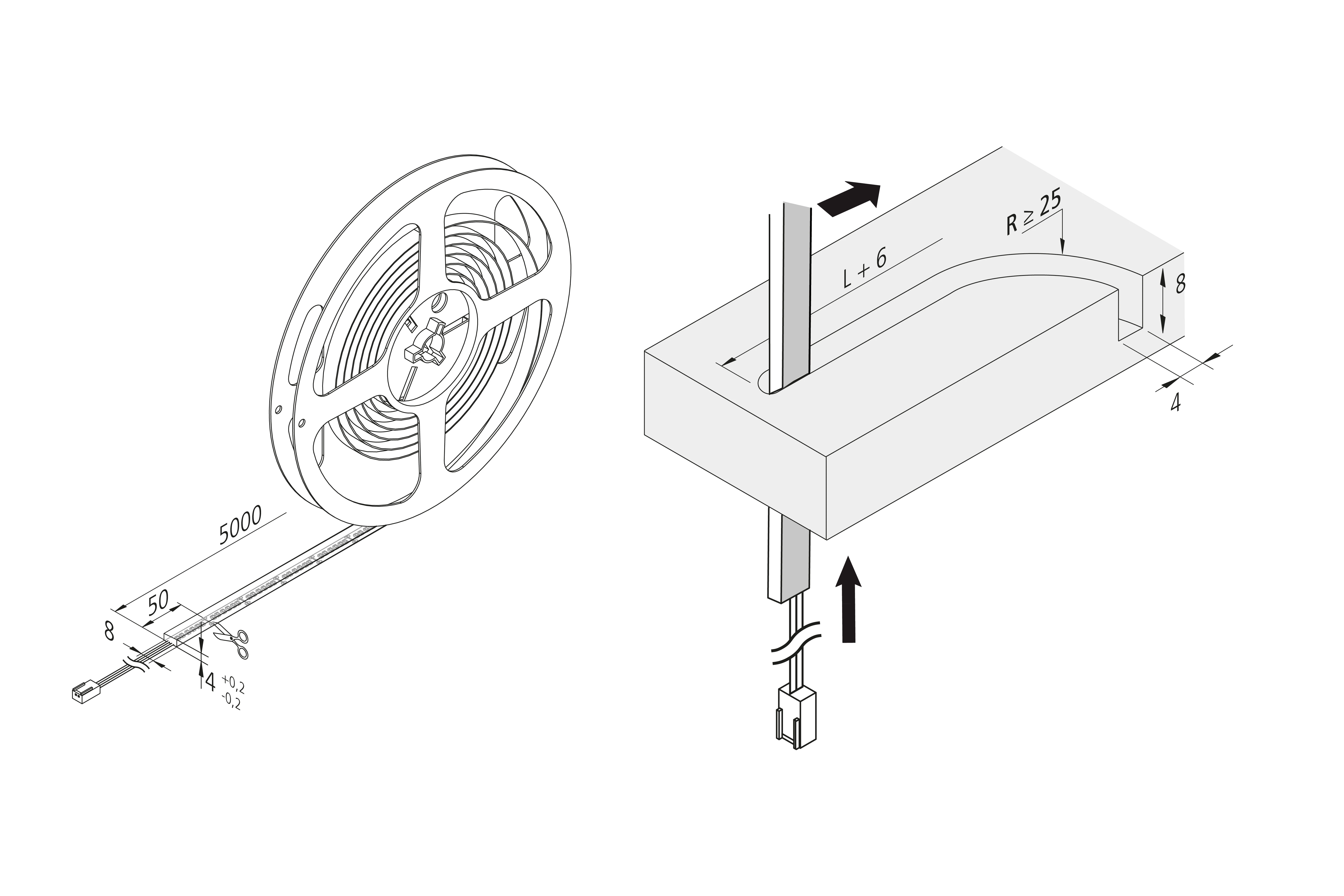 Flexible LED tape on roll, with homogeneous planar light, quick and easy installation in a 4mm wide and 8mm deep channel, incl. supply cable 2,5m with 24V-plug, the tape can be cut every 50mm (see marking on side).