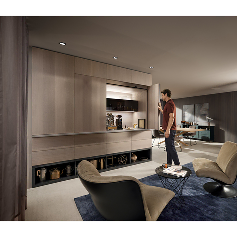 Pocket system conceal kitchen units, or even entire living areas, according to requirements: REVEGO duo, the slide-in door system for double doors with fully integrated technology, excels in terms of simple manufacturing and assembly. Standardised pocket widths of 150 mm make planning of REVEGO duo simple. The double door application REVEGO uno can be used independently or combined with the single door application REVEGO uno or with another REVEGO duo.